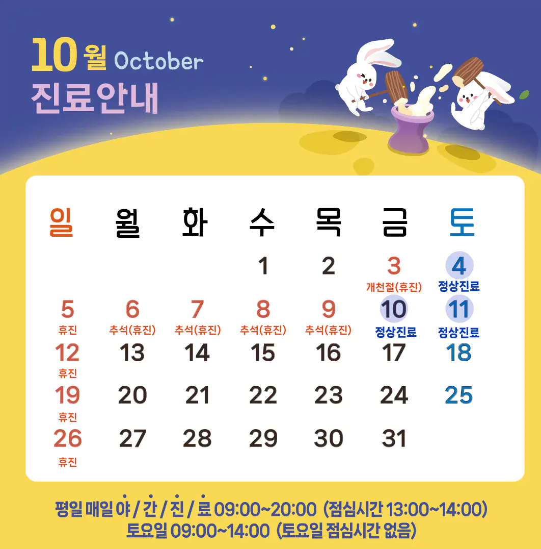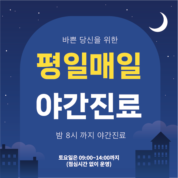 토요일 AM 9:00 ~ PM 2:00 (점심시간 없이 진료)