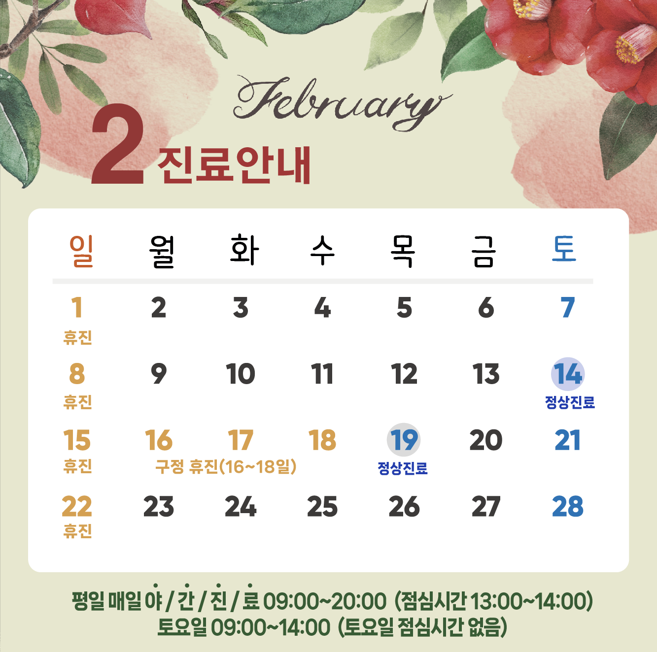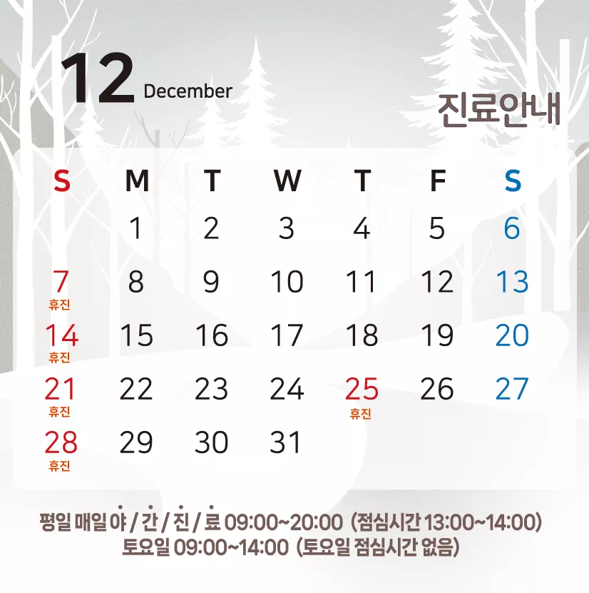 토요일 AM 9:00 ~ PM 2:00 (점심시간 없이 진료)